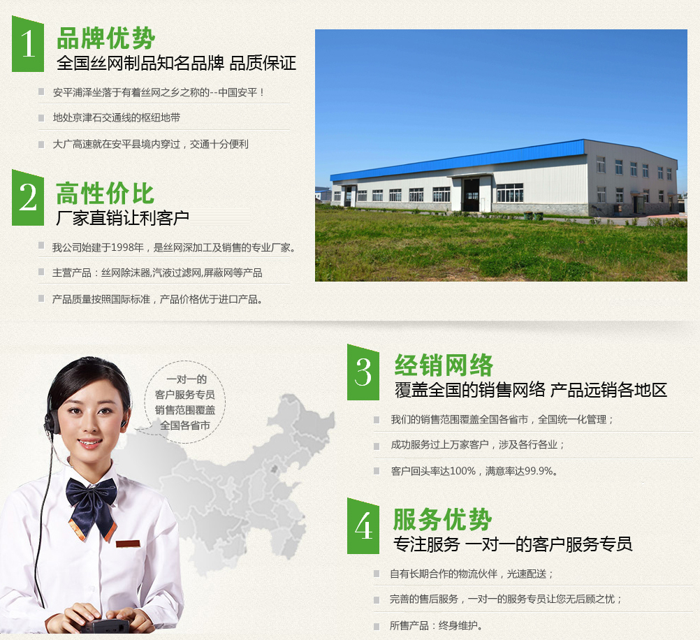 安平縣浦澤金屬絲網(wǎng)制品有限公司坐落于有著絲網(wǎng)之鄉(xiāng)之稱(chēng)的--中國(guó)安平!地處京津石交通線(xiàn)的樞紐地帶,距中國(guó)北方大港-天津港250公里,省會(huì)石家莊120公里,首都北京230公里。2010年底竣工通車(chē)的國(guó)家重點(diǎn)工程-大廣高速就在安平縣境內(nèi)穿過(guò),交通十分便利,我廠(chǎng)始建于1998年,從最早的專(zhuān)業(yè)生產(chǎn)加工,到轉(zhuǎn)型為絲網(wǎng)深加工、銷(xiāo)售一條龍的專(zhuān)業(yè)化生產(chǎn)。經(jīng)多年的蓬勃發(fā)展,現(xiàn)已成為可生產(chǎn)絲網(wǎng)除沫器,汽液過(guò)濾網(wǎng),屏蔽網(wǎng)等多種金屬網(wǎng)制品!