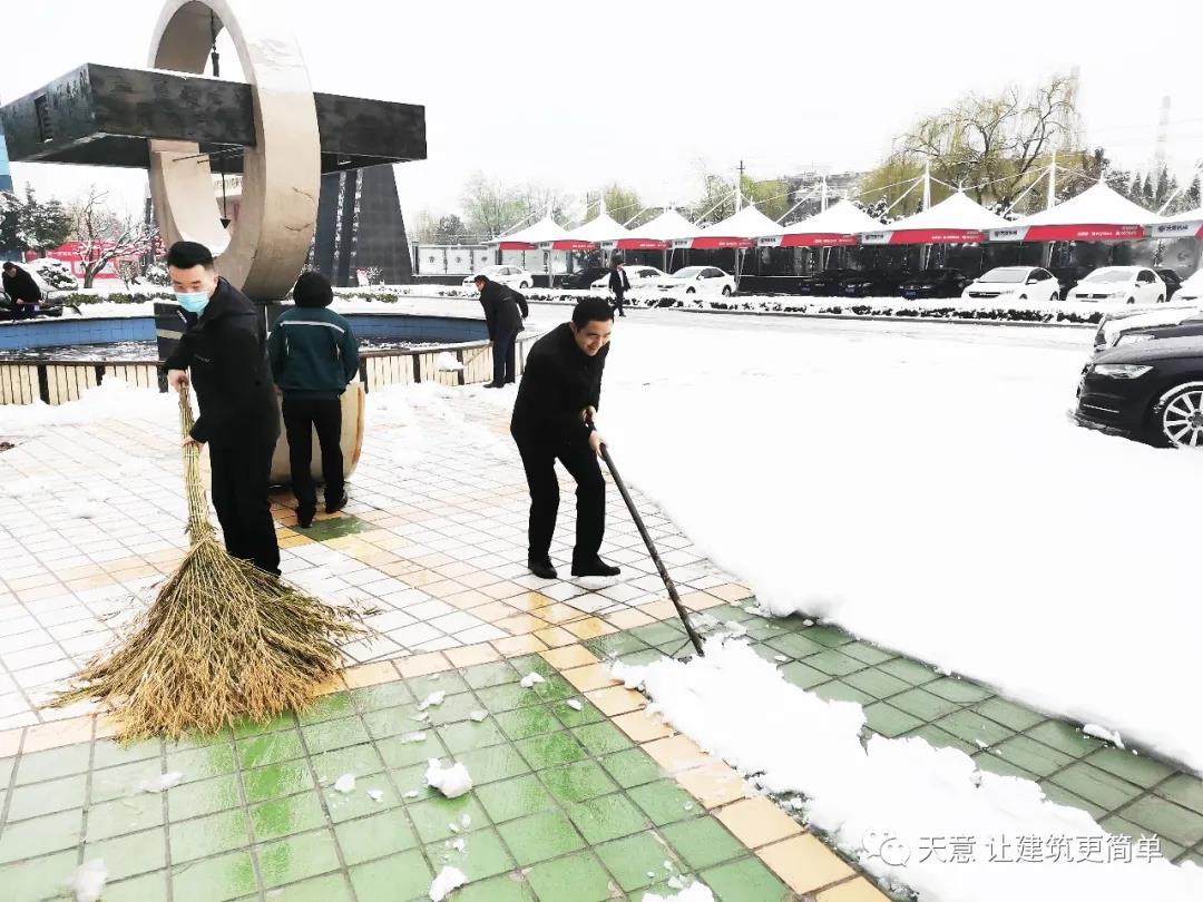 大雪悄然而至,一覺(jué)起來(lái),窗外已是銀裝素裹。然而大雪的降臨也給大家的出行帶來(lái)諸多不便,公司大門(mén)口、辦公樓前的道路都被皚皚白雪覆蓋。早晨上班前,公司總經(jīng)理劉海龍、營(yíng)銷(xiāo)總監(jiān)郭川東帶領(lǐng)公司員工拿起掃帚鐵锨,滿(mǎn)懷激情,投入除雪當(dāng)中。整個(gè)除雪作業(yè)過(guò)程井然有序,熱火朝天,干勁十足,大家不懼寒冷,不怕手凍。鐵锨和地面的碰擊聲、掃帚清掃雪花的刷刷聲,不一會(huì)兒辦公樓前的積雪已蹤影全無(wú),所到之處,雪沒(méi)了,路干凈了,掛滿(mǎn)枝頭的冰凌隨風(fēng)婆娑起舞,點(diǎn)頭稱(chēng)贊,大家的心中更是無(wú)比的欣慰,雖然凍紅了臉、累出了汗,但累并快樂(lè)著。
