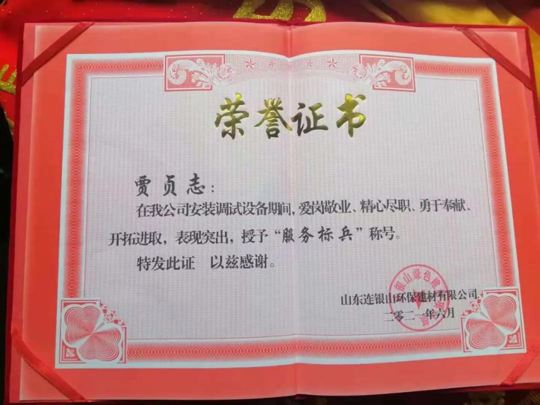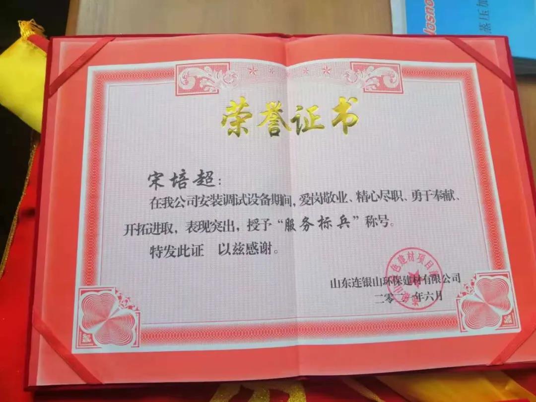 炎炎夏日,天意機(jī)械在向客戶山東連銀山環(huán)保建材有限公司售出保溫裝飾一體化板生產(chǎn)線之后,隨即派出售后團(tuán)隊對設(shè)備進(jìn)行安裝調(diào)試及售后培訓(xùn)。售后團(tuán)隊不畏酷暑,精心、耐心、專業(yè)地為客戶進(jìn)行安裝調(diào)試,贏得了客戶的好評和認(rèn)可,客戶為表達(dá)謝意,特授予天意機(jī)械售后人員榮譽證書和錦旗,以表彰售后人員愛崗敬業(yè)、精心盡職、勇于奉獻(xiàn)、開拓進(jìn)取的精神。