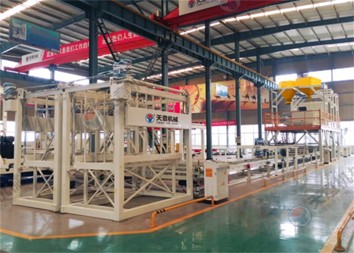 成型輸送線主要由上板輸送線、成型輸送線,加速整理輸送線及送板主機、布料主機、刮平裝置、玻纖網(wǎng)格布架等組成,主要功能是把漿料鋪設(shè)在EPS基板上并完成產(chǎn)品的成型,且輔助完成兩端雙工位碼垛機的上下架。