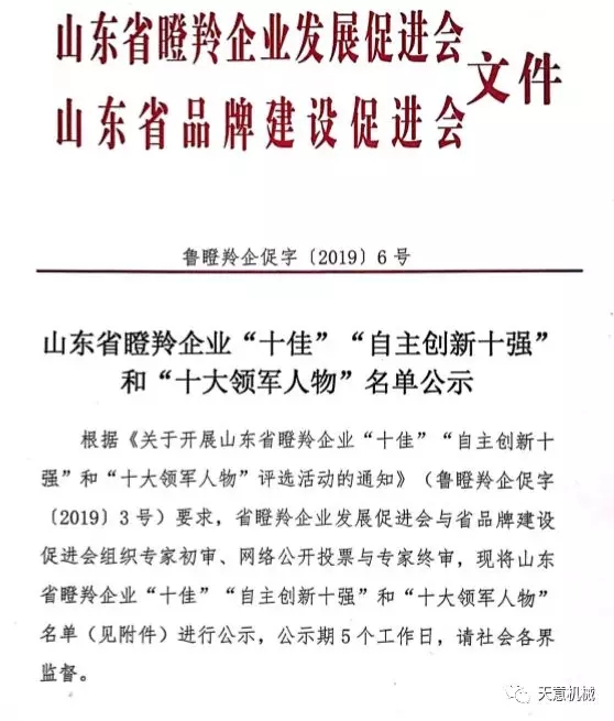 根據(jù)《關于開展山東省瞪羚企業(yè)“十佳”“自主創(chuàng)新十強”和“十大領軍人物”評選活動的通知》(魯?shù)闪缙蟠僮帧?/span>2019〕3號)要求,2019年12月6日,山東省瞪羚企業(yè)發(fā)展促進會、山東省品牌建設促進會發(fā)布魯?shù)闪缙蟠僮?/span>[2019]6號文,公布經(jīng)過專家初審、網(wǎng)絡公開投票與專家終審,評選出了山東省瞪羚企業(yè)“十佳”、“自主創(chuàng)新十強”和“十大領軍人物”。天意機械榮獲“山東省十佳瞪羚企業(yè)”稱號。