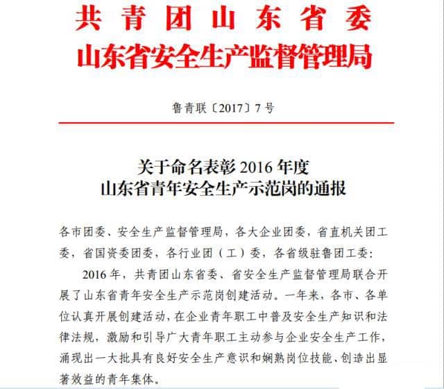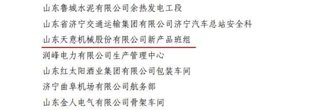 為激勵引導全省廣大青年職工強化安全生產意識,提高安全生產技能,參與安全生產管理,2016年共青團山東省委、山東省安全生產監(jiān)督管理局聯(lián)合開展了山東省青年安全生產示范崗創(chuàng)建活動。山東天意機械股份有限公司新產品班組榮獲2016年度“山東省青年安全生產示范崗”